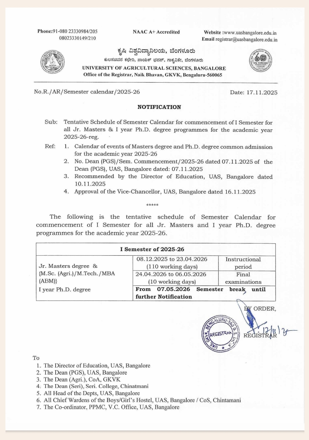Semester calender for I semester for all Jr. M.Sc. I year Ph.D. degree programmes